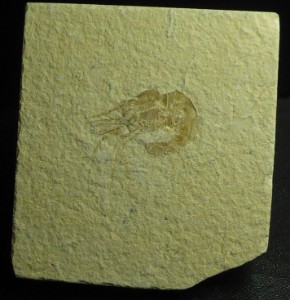 Belle plaque montrant une crevette fossile mesurant 2,5 cm.