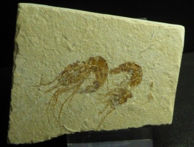 Belle plaque montrant 2 crevettes fossiles dont la plus grande mesure 3 cm.