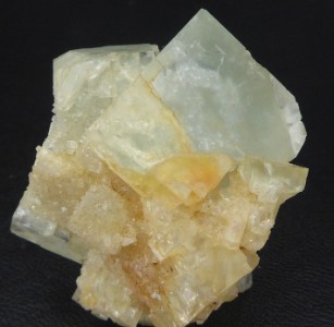 Bonne pièce montrant deux cristaux de fluorite translucide dont l'arê...