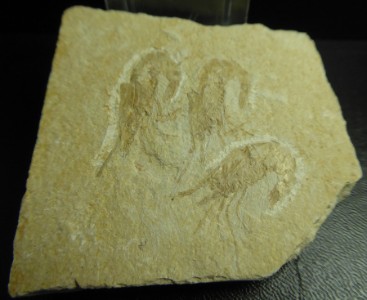 Belle plaque montrant 3 crevettes fossiles dont la plus grande mesure 3,5 cm.