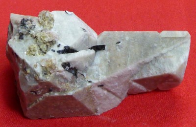 Superbe macle de microcline associée à de l'aegirine noire, du quartz...