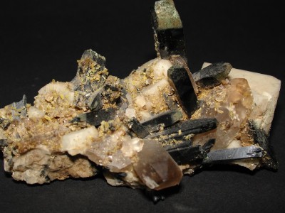 Analcime, sérandite, feldspath, quartz, zircon, parisite, natrolite, augite, glaucophane, noséane, néphéline, orthose,